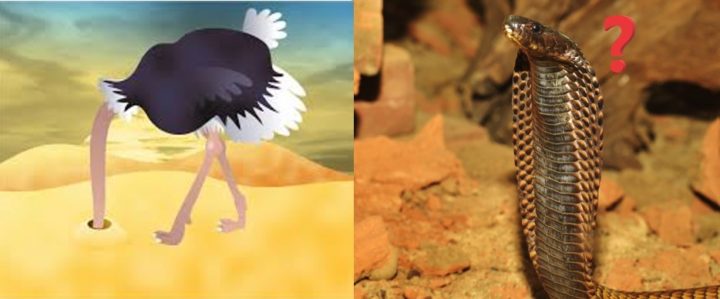 Chi non ha mai pensato di volersi sotterrare con la testa quando si trova in situazioni di disagio? Non lo struzzo! Erroneamente si pensa che lo struzzo metta la testa sotto il terreno per fuggire da situazioni pericolose, ma è FALSO. La strategia adottata da questo animale per nascondersi dai predatori è ben diversa: si china e si mette in posizione tale da mimetizzarsi per sembrare una roccia o un cespuglio sperando di passare inosservato al predatore di turno, mettendo il collo in posizione tale che la testa sembra sparire. Se questo non dovesse funzionare, allora via! Corre velocissimo il più lontano possibile per scappare, d’altronde, è uno degli animali più veloci e può raggiungere 70 Km/h. Mettere la testa sotto il terreno non funzionerebbe (la logica del: se io non lo vedo lui non può vedermi, eh eh), perché non solo non gli permetterebbe né di udire né di vedere se il predatore si stia avvicinando o meno, ma non gli permetterebbe neanche di respirare. Al massimo sottoterra può andare a cercare qualche vermetto succulento.