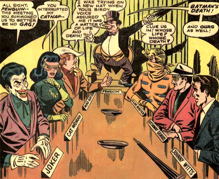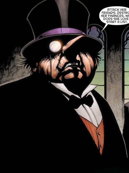 Comparso per la prima volta nel 1941, ad opera di Bob Kane e Bill Finger, il Pinguino è probabilmente il più grande nemico di Batman dopo il Joker: genio del crimine “in pensione” e boss della malavita di Gotham City, trafficante di armi e imprenditore nel mondo dei night club, si distingue per l’aspetto fisico decisamente poco minaccioso, il vestiario raffinato (che include smoking, tuba, monocolo e ombrello) e la caratteristica peculiare di essere, a differenza dei suoi “colleghi” criminali, totalmente sano di mente; caratteristica questa che lo pone in una relazione del tutto diversa con il Pipistrello, che spesso sfrutta le conoscenze e le informazioni a disposizione di Cobblepot nella propria attività.