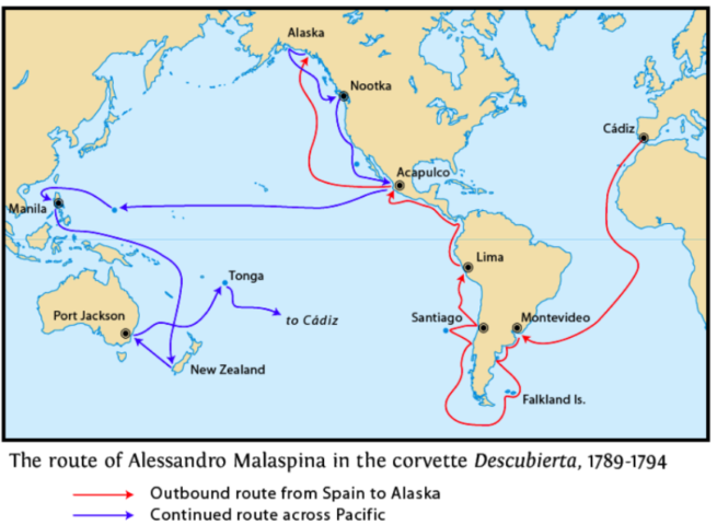 Abile uomo di mare, Malaspina maturò notevole esperienza sulle navi spagnole, riuscendo a convincere la corona della fattibilità di un viaggio intorno al mondo. Lo scopo era quello di ottenere più mezzi economici possibili per mettere in piedi una ricognizione scientifica dei luoghi di interesse spagnolo. Il 30 luglio 1789 le navi Descubierta e Atrevida salparono da Cadice con a bordo naturalisti, pittori e cartografi con a disposizione numerosi strumenti scientifici ed una fornita biblioteca. Il 20 settembre Malaspina si trovava già a Montevideo, le ricerche scientifiche potevano adesso avere inizio.
