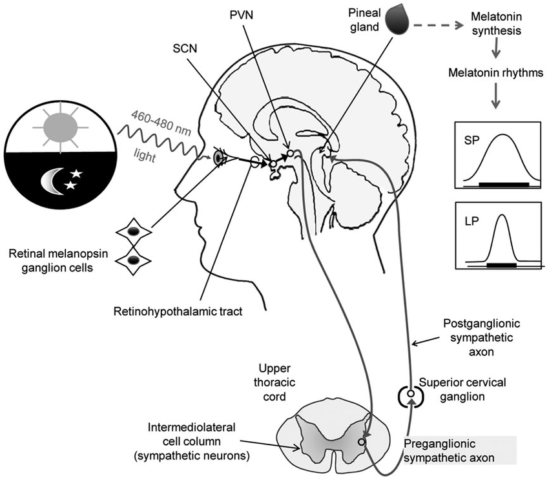 La luce influenza la secrezione di melatonina da parte della ghiandola pineale grazie a un circuito neuronale multisinaptico indiretto. La luce penetra nell’occhio mediante il foro pupillare, stimola la retina e invia i segnali al pacemaker circadiano (il nucleo soprachiasmatico ipotalamico) attraverso delle proiezioni retinoipotalamiche dirette (RHT). Un secondo sistema neurale in grado di influenzare l’attività di SCN in base al quantitativo di luce fa affidamento sul foglietto intergenicolato del talamo (nucleo nel complesso talamico laterale circondato dorsalmente per quasi tutta la sua lunghezza dal nucleo genicolato laterale dorsale e ventralmente dal nucleo genicolato laterale ventrale). Dal SCN, gli impulsi viaggiano verso la ghiandola pineale, contraendo prima sinapsi a livello dei nuclei paraventricolari dell’ipotalamo, discendendo poi per sinaptare nella colonna intermediolaterale del tratto spinale toracico superiore, riproiettandosi al ganglio cervicale superiore, e risalendo accanto ai vasi cerebrali principali fino a raggiungere la ghiandola pineale.