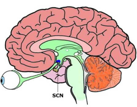 Da un punto di vista anatomico il SCN è una struttura neuronale ovviamente pari posizionata nell’ipotalamo anteroventrale, su ciascuno lato del terzo ventricolo, appena superiormente al chiasma ottico. Ciascun nucleo unilaterale contiene circa 10.000 neuroni divisi in un core ventrale (che supera il chiasma e riceve informazioni dalla retina) e una shell dorsale (che si avvolge parzialmente e riceve gli input dal core). L’SCN è composto anche da cellule gliali che possono potenzialmente contribuire alle funzioni pacemaker. Infatti gli astrociti hanno mostrato dei ritmi circadiani di espressione genica.