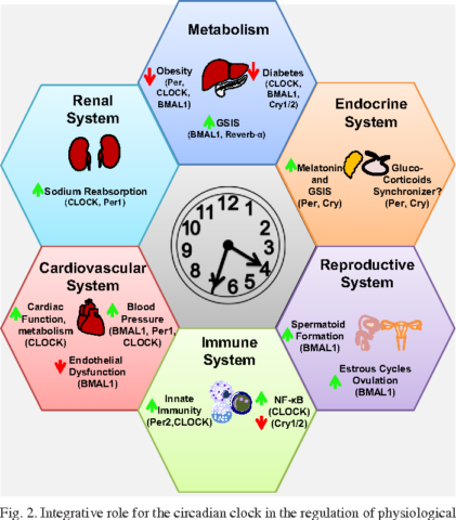 Il piccolo nucleo soprachiasmatico (SCN) dell’ipotalamo gioca un ruolo centrale nella programmazione giornaliera delle funzioni dell’organismo, regolando di giorno in giorno le oscillazioni delle attività cellulari e sincronizzando le stesse in base ai cicli di luce e di buio. Questo orologio biologico guida l’espressione giornaliera di funzioni omeostatiche vitali anche diverse fra loro, come nutrirsi, bere e termoregolarsi. L’SCN impone un ordine temporale mediante la genesi di segnali di output che forniscono informazioni relative all’orario della giornata e attraverso l’accumulo di informazioni in entrata in grado di mettere a punto questo orologio intrinseco del corpo.