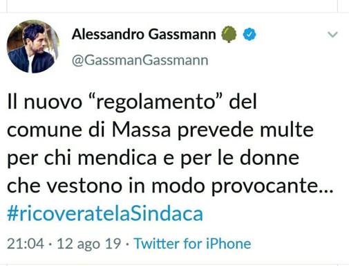 Al centro delle polemiche delle nuove norme approvate nella cittadina incombe il divietodi indossare abiti provocanti, avere atteggiamenti di richiamo o allusivi. Questo regolamento ha creato non poca confusione e opinioni contrastanti sul mondo del web, fino a definire questa condotta, secondo alcuni utenti, un “buon 1919” ma anche “il medioevo è contagioso”, la celebre cantante Fiorella Mannoia esterrefatta da questo gesto, si domanda come possa essere lecito questo trattamento, scrivendo: “Ditemi che è uno scherzo. I cittadini di Massa accettano tutto questo?”Chi bensì ha provocato più scalpore è stato l’attore e regista Alessandro Gassman il cui tweet ha ricevuto un’accesa risposta da parte del sindaco e del vicesindaco definendola una persona disinformata e non adatta a giudicare ciò che sta avvenendo a Massa.