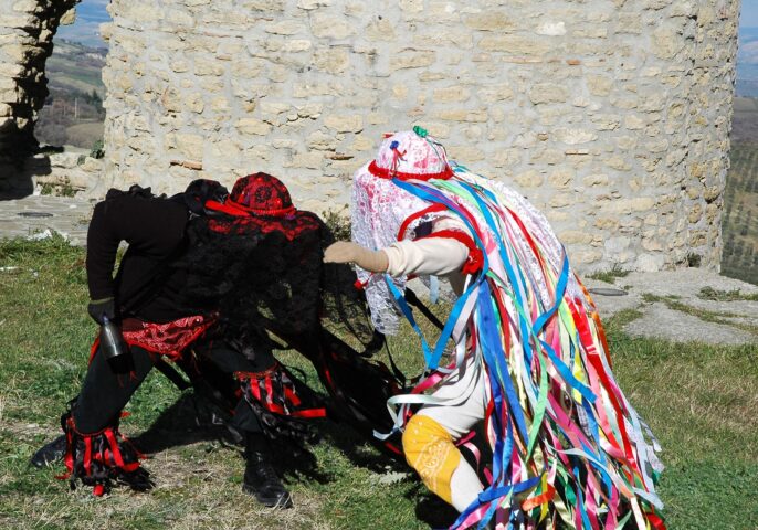 Quando si pensa al carnevale italiano, viene quasi spontaneo immaginare quelle donne e quegli uomini dagli abiti raffinati e dai volti enigmatici passeggiare lungo il Canal Grande di Venezia. Il Bel Pese, però, si differenzia da tutti gli altri per la bellezza che si nasconde non solo dei grandi centri, ma anche e soprattutto nelle piccole realtà. C’è una regione tra tutte che eccelle per tradizione carnevalesca: la Basilicata. Sono numerosi i paesi lucani che da decenni ormai organizzano sfilate e spettacoli in questo periodo dell’anno: Tricarico, Satriano di Lucania, Montescaglioso, Cirigliano, Aliano, Lavello, Teana e Stigliano. Il loro minimo comune denominatore? Il legame mistico e inscindibile tra uomo e natura. Questa relazione, già ampiamente descritta da Boccaccio in alcune delle novelle del “Decameron”, permette di accentuare, attraverso diverse maschere animalesche l’umiliazione pubblica, il riso e la beffa tipicamente carnevalesche. Non a caso la maschera tipica tricaricese è proprio quella di un toro/mucca, caratterizzata da un copricapo nero o bianco decorato con nastri lunghi e colorati che ricoprono interamente la figura. Il connubio tra uomo e natura raggiunge, però, il suo apice a Satriano con la così detta “Foresta che cammina” dove gli uomini diventano alberi e viceversa, durante una lunga passeggiata tra i boschi governati dalla figura mitologica del Rumita.