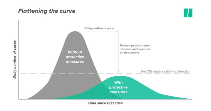 L’obiettivo primario che una nazione colpita dal Coronavirus dovrebbe prefiggersi è quello che in inglese è detto flattening the curve. Sicuramente vi sarà capitato di osservare in questi giorni un’immagine come quella che segue nel paragrafo, dove si mostra il numero di casi positivi in funzione del tempo. Ovviamente esiste un massimo che ogni nazione può sopportare col suo sistema sanitario ed è rappresentato dalla linea orizzontale detta anche Healthcare system capacity, ossia quante persone realmente il SSN può accogliere per un’eventuale trattamento ospedaliero dopo aver contratto il virus. Si può anche constatare che, senza prendere misure, il numero di casi nell’intervallo di tempo raggiunge picchi superiori rispetto alla capacità delle strutture ospedaliere mentre, applicando delle misure preventive, tale curva tende proprio ad assottigliarsi (flattening) e a spargersi su un intervallo temporale maggiore, restando comunque al di sotto del limite massimo imposto dal SSN.