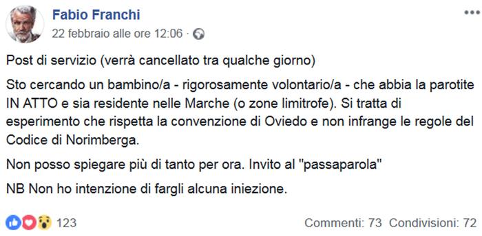 Allo stesso modo il virologo Roberto Burioni ha scritto su Twitter. “Bisognerebbe fare qualcosa”, senza sbilanciarsi troppo. Della stessa opinione il collega Guido Silvestri, docente di Patologia generale alla Emory University di Atlanta. “Non è il momento di dire basta? Ma cosa altro deve fare l’ex-medico Fabio Franchi perché intervenga una qualche Procura della Repubblica per iniziare un provvedimento penale nei suoi confronti?“, ha chiesto su Facebook. “Questo – ricordo – è il signore che ha scritto un libro per ‘dimostrare’ che Hiv e Aids non esistono, diffondendo così in Italia teorie che hanno provocato centinaia di migliaia di morti nel mondo – ha scritto ancora Silvestri – Adesso questo signore scrive via Facebook che vuole fare un ‘esperimento su un/a bambino/a con parotite’. Una cosa pazzesca, che violerebbe qualsiasi principio etico della nostra professione nei modi e nella sostanza”.