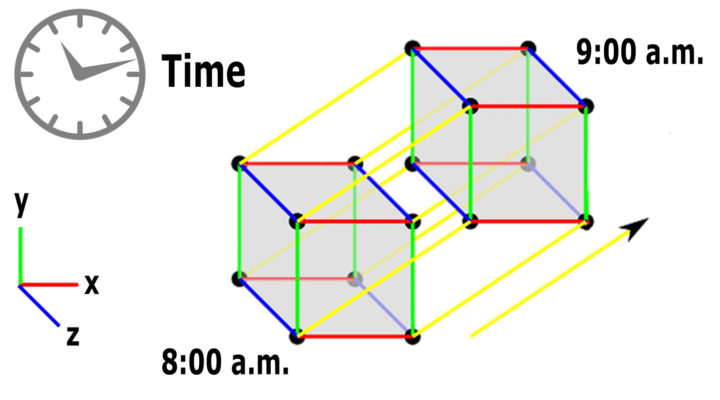 L’idea che lo spazio e il tempo siano dei concetti relativi e che ci sia una quarta dimensione temporale nasce dalla relatività ristretta di Einstein. Egli scopre che a velocità relativistiche (prossime alla velocità della luce), il tempo si dilata (ovvero passa più lentamente) e lo spazio si restringe. Quindi, se abbiamo due gemelli di cui uno resta sulla terra e l’altro parte dalla terra e compie un viaggio spaziale in una navicella che viaggia a velocità relativistiche, il gemello astronauta quando tornerà sulla terra sarà più giovane rispetto all’altro perchè per lui il tempo sarà trascorso più lentamente. Un ragionamento simile si può fare con lo spazio: le lunghezze si restringono a velocità relativistiche.
