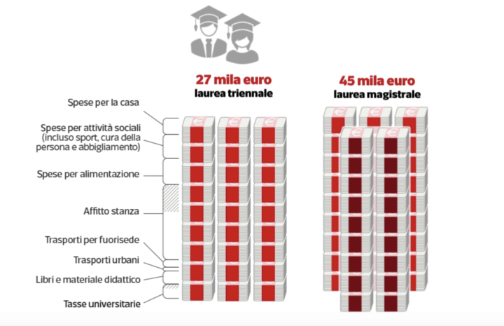 Secondo Federconsumatori chi ha la fortuna di vivere in famiglia in una città sede di ateneo, spende mediamente 3.000 euro annui, spese delle rette e dei testi. Ma per i fuorisede, l’investimento è molto più alto perché bisogna aggiungere le caparre, le utenze, gli alimenti e gli spostamenti. Vale a dire almeno 9.000 euro l’anno, 27.000 per una Laurea Triennale, e fino 45.000 se si prosegue con il biennio Magistrale. Oltre ai sacrifici economici la famiglia deve contemplare l’idea che il figlio migri altrove, vale a dire sacrifici in termini affettivi. Secondo una rivelazione Istat, circa il 10% ha gettato le redini come Lisa, in quanto il reddito familiare medio non supera i 2.500 euro, troppo pochi per sostenere le spese universitarie e di mantenimento. Il lasso di tempo di circa sette secoli non ha di certo mutato la natura dei sacrifici che si debbono fare ai fini di godere di una buona istruzione. Anche se oggi non si mobilita un’intera comunità per racimolare il necessario che serve a fronteggiare le spese relative all’istruzione, una famiglia moderna fa di tutto, forse anche in un tempo antecedente alla nascita dei figli, per ovviare a questa difficoltà. Vanno per la maggiore fondi di accumulo e i prestiti; entrambi si traducono in termini di sacrifici.