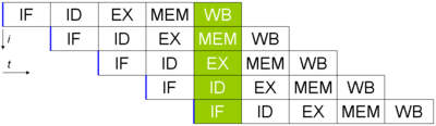 Immaginiamo di dover fare il bucato, questa azione può essere scomposta in 5 fasi: selezione dei vestiti, lavaggio, asciugatura, stiro, riporre i panni nei cassetti opportuni. Quando il processore deve eseguire un’istruzione scompone il processo in 5 fasi: prelievo dell’istruzione, decodifica, esecuzione, lettura/scrittura della memoria, scrittura dei registri di sistema. Tornando al nostro bucato possiamo adottare due approcci operativi: lavare un carico di vestiti alla volta, aspettando che il primo sia completamente riposto nei cassetti prima di lavare il secondo, o lavare il secondo non appena il primo comincia ad asciugarsi. E` ovvio che il secondo approccio e` migliore in termini di tempo: questo non perché` il tempo di lavaggio venga effettivamente accorciato ma piuttosto perché il tempo complessivo che occorre per lavare più di un carico e` minore. Nel processore MIPS abbiamo lo stesso concetto: il processore comincia la fase di prelievo della seconda istruzione quando la prima e` in fase di decodifica ecc.. In tutto possono essere eseguiti cinque istruzioni in stati diversi in contemporanea.
