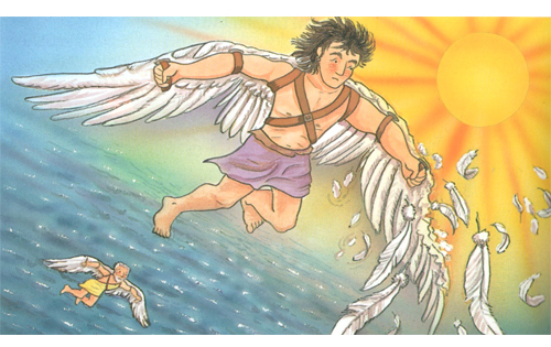 Icaro, nella mitologia greca, era il figlio di Dedalo, costruttore del celebre labirinto di Creta dove era chiuso il Minotauro. Padre e figlio erano dunque a conoscenza dei segreti di quella struttura che per gli altri non doveva presentare alcuna via di fuga. Fu Dedalo a suggerire a Teseo, che voleva uccidere il mostro, di servirsi di un gomitolo di lana da srotolare durante l’ingresso per poter ritrovare facilmente la via di uscita dopo aver sconfitto il Minotauro. Per questa ragione, secondo alcune versioni del mito, vennero imprigionati all’interno del labirinto stesso e privati di acqua e di cibo.