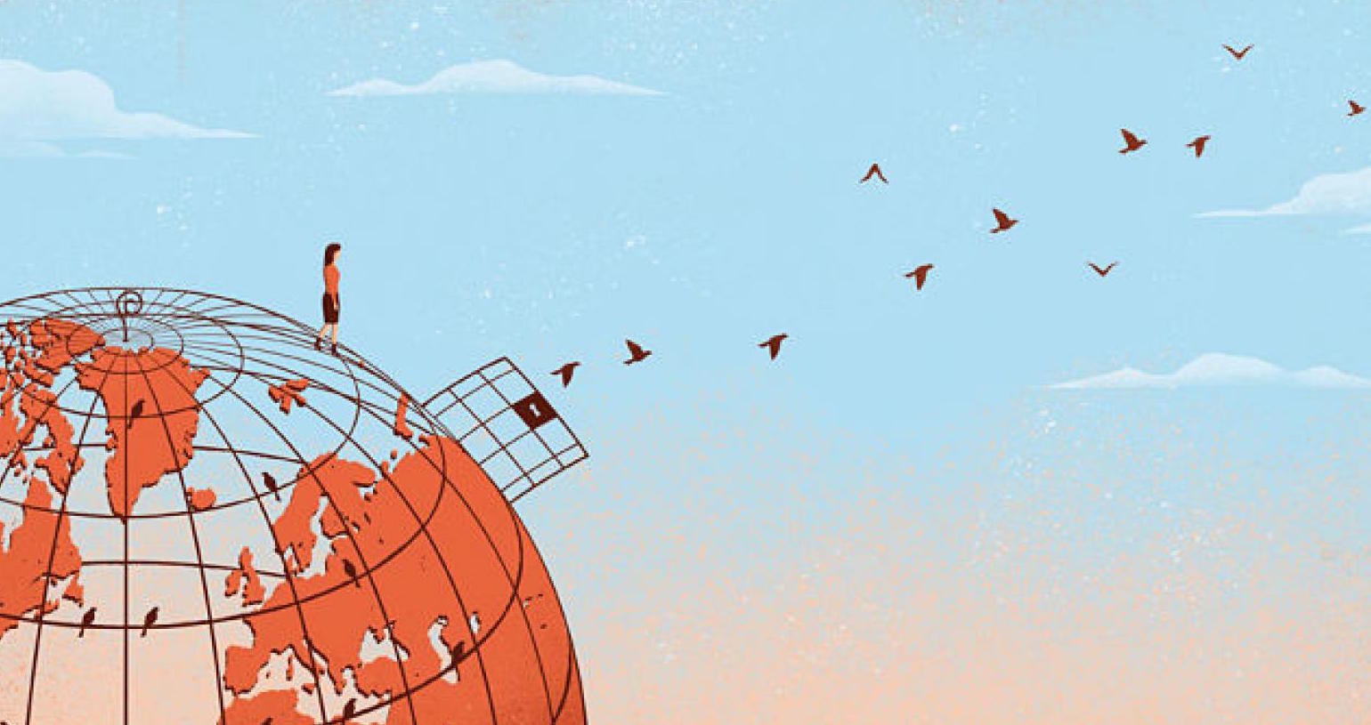 Quante volte viene preso in causa il termine libertà quando una conversazione tra amici prende una piega politica o sociale? Man mano che la tecnologia avanza e le speranze di un progresso aumentano, proporzionalmente si manifestano arie di protesta e di paura. Il sentimento comune sottostante a tali preoccupazioni è la consapevolezza del rischio derivante dal cambiamento: nel momento in cui si compie un salto dal terreno della consuetudine verso orizzonti ancora inesplorati, la paura è soprattutto quella di perdere le gioie e le sicurezze che già si conoscono. La libertà è tra questi elementi, ed indica un indefinito senso di spontaneità, non-costrizione e possibilità di azione. Il senso comune affida a questo termine una sensazione positiva e lo lascia aperto alle varie interpretazioni affinché chiunque possa definirlo come meglio crede. Davide Bonazzi, nato e cresciuto a Bologna, è ormai diventato famoso per le sue illustrazioni che ritraggono alcune problematiche riguardanti la contemporaneità. Le forme semplici e dirette delle sue rappresentazioni gli hanno valso la collaborazione con enti internazionali come The New York Times, The Wall Street Journal, Wired, UNESCO, Gatorade, Timberland, Paramount e molti altri. Il filo rosso di molti dei suoi lavori è il riferimento alla libertà personale e al suo equilibrio instabile in un presente globalizzato come il nostro, dove i vantaggi di una comunicazione istantanea mostrano il verso della medaglia nell’isolamento del soggetto, incapace di esprimere il contatto diretto ed emotivo con chi lo circonda fisicamente. In questo senso il valore del sentimento esprime una libertà oggettiva, che apre alle molte possibilità oltre la sfera territoriale, rinunciando tuttavia alle consuetudini e all’interazione umana. L’ambizione che può sorgere dalla visione di tante opportunità può farci perdere il senso del limite e la conoscenza delle nostre reali possibilità. D’altro canto essa ci permette di giungere ad obbiettivi importanti che potrebbero influire sul giudizio di noi stessi. Davide Bonazzi è in grado di esprimere l’ambiguità con linee asciutte, poche variazioni di colore, opposte e complementari.