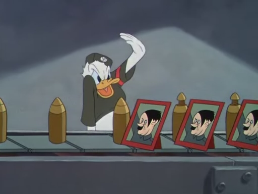 Le difficoltà che si dovettero affrontare sia dal punto di vista sociale che economico – ma soprattutto umano – misero i Paesi allora coinvolti, in posizioni poco agevoli. Era inevitabile che tutti i fronti venissero coinvolti e che tutti i canali di espressione versassero – quando possibile – il loro contributo. E’ il caso di questo cortometraggio pensato e ideato durante gli anni della guerra per fini propagandistici, ma che oggi, conserva un forte impatto. Der Fuehrer’s Face fa parte di una serie di cortometraggi che ricadono sotto l’etichetta del nome del protagonista, Donald Duck e che comprendono progetti databili dal 1937 al 1959. Qui Paperino viene buttato giù dal letto dai leader dell’Asse. Egli va con loro e dopo aver eseguito il saluto nazista ai ritratti di Hitler, Mussolini e Hirohito, si accinge a fare colazione. Il pasto è povero, tratto che viene ironizzato: mangia un solo pezzo di pane secco e prepara il caffè con un solo chicco, dopo ciò lo aspettano due giorni di lavoro in fabbrica.