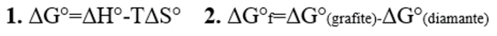 semplificando molto il concetto, l’energia libera è data dalla differenza tra l’entalpia (che misura il “calore” di un sistema) e il prodotto di temperatura ed entropia (che è tanto più grande quanto un sistema è “disordinato”) (equazione 1). Essendo il diamante una struttura altamente ordinata, la sua entropia è molto bassa ed è minore rispetto a quella della grafite. Per il processo di formazione della grafite a partire dal diamante (equazione 2), occorre sottrarre all’energia libera del prodotto quella del reagente. Dato che il ΔG° della grafite è minore di quello del diamante (perché l’entropia è maggiore in quanto più “disordinata” mentre l’entalpia è minore), il risultato è negativo, quindi il processo è spontaneo.