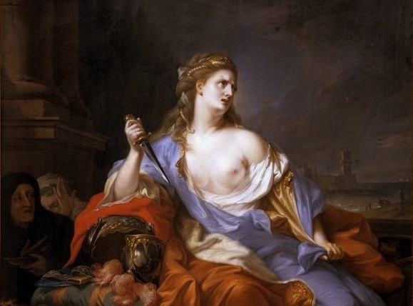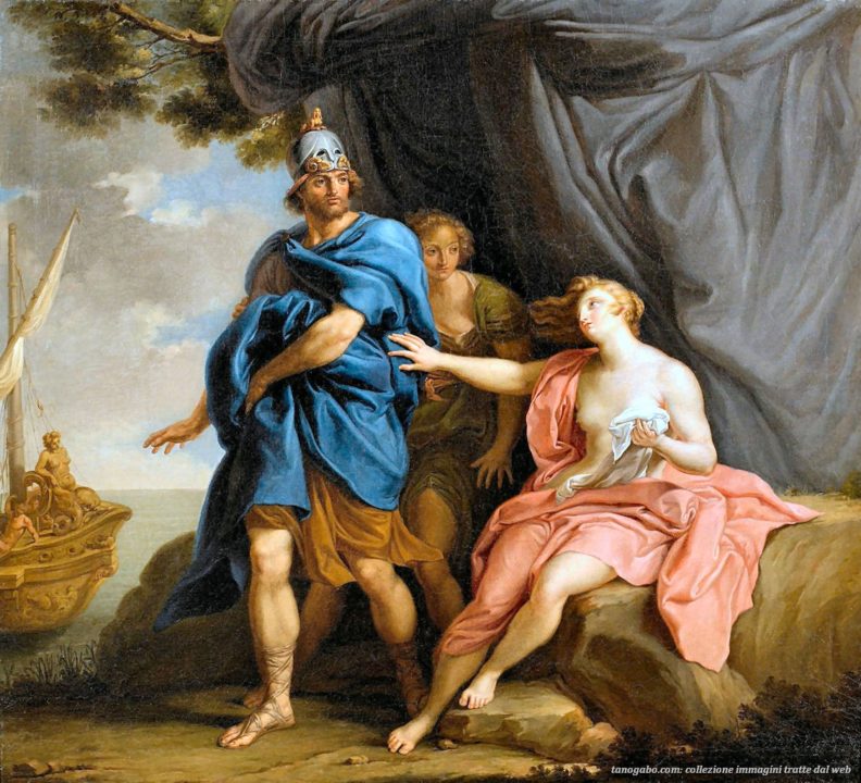 Didone è la fondatrice e la prima regina di Cartagine una potente città che domina le coste africane occidentali, figlia del re di Tiro Belo e vedova di Sicheo. Didone è uno dei personaggi principali del capolavoro del poeta latino Publio Virgilio Marone, destinata a perire a causa dell’amore impossibile che la lega, quasi per un capriccio degli dei, all’eroe Troiano Enea. La vicenda si svolge dopo la missione divina imposta ad Enea, sopravviussuto vittoriosamente alle fiamme che hanno devastato la sua città natia, Troia. Enea ottiene, infatti, il compito di partire per un lungo viaggio in mare che l’avrebbe portato a fondare la nuova stirpe Italica. Durante il viaggio però, gli dei, che giocano un ruolo fondamentale in tutta la vicenda, decidiono di “ostacolare” l’intento del giovane Eroe, in particolar modo Giugnone la quale nemica acerrima dei Troiani cerca di fermare Enea scatenando una terribile tempesta che lo porterà proprio nella bella città di Cartagine. Qui, il personaggio virgiliano giunge alla corte della regina cartaginese, Didone, invagendosi di lei. Didone, dal canto suo, rompe la promessa di eterna fedeltà al defunto marito e si lascia vincere dalla mordacità della passione ingara del suo triste destino. Virgilio, infatti, non permette ai due un lieto fine ma, un immortale tragedia, il poeta ritrare la donna come completamente asuefatta dall’amante tanto da lasciare in secondo piano il suo profilo publico e la sua reputazione correndo il rischio di perdere la stima della propria gente. Presa dalla passione e dall’amore frentato nonchè fisico, Didone si concede e sogna di diventare la futura consorte dell’eroe Troiano con il quale poter fondare una nuova stirpe. Purtroppo però, il poeta richiama all’appello l’intervento degli dei: Giove ricorda ad Enea la sua missione impenendogli di abbandonare Cartagine senza la sua regina, così Enea annuncia, seppur dolorosamente, la sua dipartita . Didone cade nella profonda disperazione: