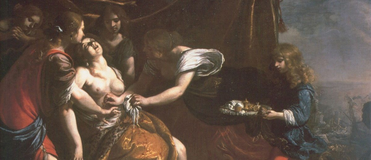 impazzita per la città: le sembra di vedere ovunque il volto dell’amato e ormai vuole solo morire” Didone guarda le navi Troiane salpare dal porto di Cartagine, Virgilio la ritare come una donna qualsiasi, una donna al parti di tutte coloro che tradite ed umiliate cercano invano una cura alla propria disperazione. Vunerabile, sola e ormai esposta al giudizio del suo popolo, Didone arriva ad una sola conclusione :il suicidio, impugnata la spada regalatale proprio da Enea, la regina si uccide sferzando una maledizione contro il suo amato e la sua stirpe ed implorando di essere vendicata.