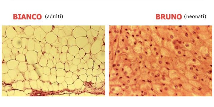 Il tessuto adiposo bianco e quello bruno sono diversi sia morfologicamente che funzionalmente. Il tessuto adiposo bianco è quello di norma più abbondante nel nostro corpo e appare esteticamente giallognolo poiché formato da cellule il cui citosol è occupato quasi interamente da una grande goccia lipidica, è infatti il tessuto predisposto al ruolo di conservazione dell’energia in eccesso che potremmo utilizzare in altre situazioni quando il nostro corpo necessita di energia ma non ha a disposizione del cibo. Il tessuto adiposo bruno è invece meno presente, in particolare la distribuzione di tessuto bruno diminuisce con l’avanzare dell’età fino ad essere quasi assente nelle persone molto anziane mentre costituisce circa il 5% del peso di un bambino. Come suggerisce il nome esso appare più scuro, tendente al marrone, e a differenza di quello bianco presenta un nucleo centrale non schiacciato dalla goccia lipidica proprio perché la sua funzione non è quella di deposito di energia ma quella di termogenesi, ovvero di produzione di calore, per questo ha un maggior numero di mitocondri rispetto a quello bianco, importanti proprio per la produzione di calore. La caratteristica interessante dell’organo adiposo è la plasticità, ovvero la possibilità della forma bianca e bruna di intercambiarsi a seconda della situazione. Una persona che mangia eccessivamente, che compie poca attività fisica predispone il suo organismo ad un costante eccesso di energia (surplus dell’intake energetico) che se non ha necessità di dissipare sotto forma di calore è “costretto” a conservare sotto forma di trigliceridi che verranno conservati nelle cellule che compongono il tessuto adiposo bianco, presente sia sotto la pelle, in modo da formare delle fasce isolanti termiche, sia attorno agli organi interni, mentre il tessuto adiposo bruno si trova soprattutto in sede paracervicale, sopraclavicolare, interscapolare, e perirenale. Un’altra differenza tra i due è che quello bruno è molto più vascolarizzato, in modo da distribuire meglio il calore, ed innervato, poiché risponde al sistema nervoso simpatico. Inoltre esiste una tipologia intermedia tra i due chiamato tessuto adiposo beige che presenta le caratteristiche di entrambi i citotipi a seconda della situazione.