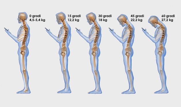 Secondo uno studio condotto dal professor Hansraj ,che ha misurato il peso sulla colonna legato alle varie inclinazioni del capo (dai 15 ai 60 gradi) , il nostro amore per i cellulari ha permesso che incrementasse il numero di giovani con problemi alla schiena: l’ammontare del tempo passato a guardare in basso può porre sotto pressione la nostra colonna vertebrale. Fissare lo schermo può imprimere una pressione di circa 27 kg al rachide cervicale che viene sottoposto ad un sovraccarico eccessivo ed ad uno stress ripetuto. Piegando troppo il collo si rischia di assumere una posizione scorretta per circa 1400 ore l’anno.