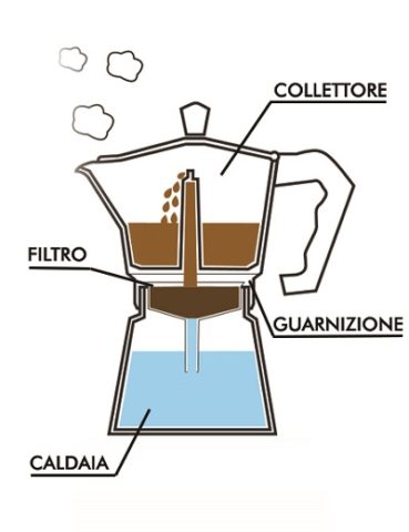 Ora, quando si pone la Moka sul fuoco, la caldaia subisce un processo di riscaldamento. In conseguenza, la temperatura dell’acqua si alza e l’aria presente si espande. Tuttavia quest’ultima, a causa della presenza del filtro, non può diffondersi verso l’alto, mentre può benissimo esercitare una forza sulla superficie dell’acqua ivi presente. Questa risponderà risalendo attraverso il filtro e fuoriuscendo nel nostro serbatoio sotto forma di caffè. Tutta la seguente fase è definita ‘ Estrazione regolare ‘.