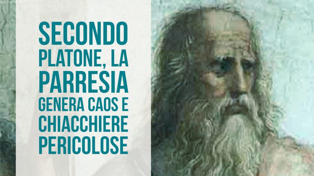 In Platone invece la parresia è vista sotto una luce negativa. Secondo Platone è ‘chiacchiera‘. Il dire tutto senza veli, secondo Platone, permette di dire anche cose pericolose e cose sbagliate. In Platone il parresiastes è colui che ‘chiacchiera senza freni’, che dice tutto senza riflettere. Il filosofo paragona la parresia alla democrazia, dove ognuno può dire qualsiasi cosa ai cittadini. Questo secondo Platone genera caos e chiacchiere pericolose.