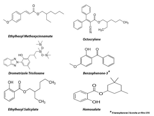 I filtri solari vengono abitualmente suddivisi in due gruppi: filtri chimici e filtri fisici. In verità, una distinzione che utilizza una terminologia di questo tipo potrebbe essere fuorviante e non propriamente corretta. Difatti, tutti i filtri solari sono composti chimici in grado di proteggere – attraverso differenti meccanismi d’azione – la pelle dai raggi UV. Tutti i filtri solari sono, infatti, in grado di assorbire, riflettere o diffondere le radiazioni ultraviolette in maniera più o meno accentuata: alcuni di essi ne assorbono una piccola porzione e ne riflettono la maggior parte; altri, invece, presentano capacità assorbenti la radiazione maggiori.