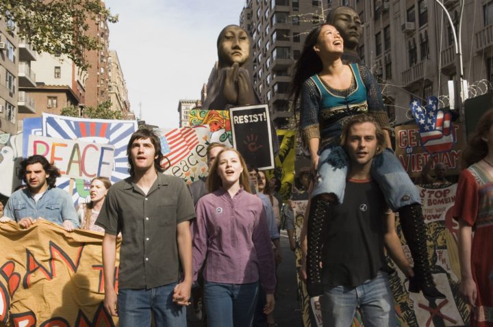 “Across the Universe” (2007) è la storia di Jude, un operaio inglese, che parte per gli Stati Uniti alla ricerca di suo padre, che conoscerà a Princeton, dove egli lavora. Qui farà amicizia con Max, universitario bello ma scapestrato, col quale si trasferirà a New York. In un’atmosfera pienamente vintage, psichedelica e affascinante, i due ragazzi condurranno uno stile di vita degno degli hippie di un tempo, tra rock, amore libero e manifestazioni contro la guerra in Vietnam. La vita di Jude prenderà, però, una piega inaspettata quando conoscerà Lucy, ingenua e attraente sorella di Max, con cui avrà un’appassionante storia d’amore. Così, la regista Julie Taymor ci fa immergere nell’America degli anni Sessanta, raccontandoci una love story avvincente e trascinante. Ancora, il film sembra toccare ampiamente ogni argomento di attualità del tempo: il razzismo del tempo, accentuato dalla visione in TV del discorso “I have a dream” di Martin Luther King, la pratica dell’amore libero, senza porre differenze di alcun tipo, la sperimentazione delle droghe, infine la guerra in Vietnam e le conseguenti manifestazioni dei radicali contro di essa.