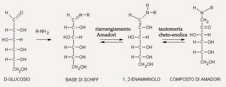 Tutto comincia col legame del carbonio carbonilico di uno zucchero riducente che lega l’N-terminale di un amminoacido, dando come prodotto una glicosammina. Questa molecola appena formata subisce un riarrangiamento dei legami che sfocia in due possibili alternative, un prodotto di Amadori (che coincidenza eh) se lo zucchero di partenza era aldoso, di Heyns se era chetoso. Questo riarrangiamento è catalizzato dalla presenza di acidi. Inoltre già in questa fase in prodotti come il latte sterilizzato può portare alla degradazione delle lisine al suo interno e quindi alla perdita di alcuni AA essenziali.