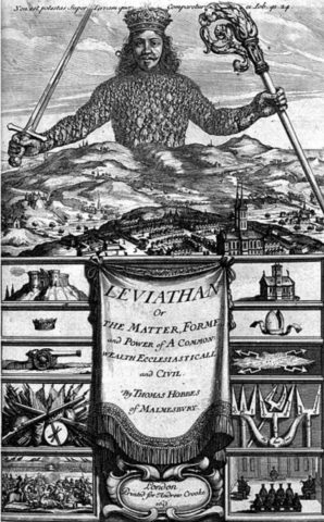 Il Leviatano, l’opera che lo consegnerà ai posteri, viene pubblicata nel 1651 quando in Inghilterra si era appena consumata la guerra civile. Quest’opera mette in discussione lo stato moderno, la sua legittimità e la forma che assume. La copertina, mostra lo stato come un gigante, composto da tanti piccoli uomini. Nella mano sinistra tiene una spada, simbolo del potere temporale, nella mano destra tiene il pastorale, simbolo del potere religioso. Il concetto alla base si questo libro è esplicato nella seconda parte del libro: “Io autorizzo e cedo il mio diritto di governare me stesso a quest’uomo o a quest’assemblea di uomini, alla seguente condizione, che tu gli ceda il tuo diritto e autorizzi le sue azioni in maniera simile. La moltitudine di persone sarà chiamato Stato, in latino civitas. Questa è la generazione di quel grande Leviatano, al quale noi dobbiamo, sotto il Dio immortale, la nostra pace e la nostra difesa“. Per liberarsi della competizione fra loro, la moltitudine deve creare uno stato che garantisca efficienza e sicurezza degli individui, condizione che per Hobbes è alla base per il perseguimento dei desideri. Ogni persona deve cedere una parte di sovranità, i suoi diritti naturali a un monarca o a un’assemblea di uomini, che garantisca pace nella società.