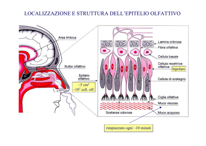 Quando si inspira, le molecole presenti nell’aria dapprima diffondono nel muco stratificato della mucosa olfattiva e in seguito stimolano i recettori olfattivi, neuroni specializzati caratterizzati da un alto tasso di rigenerazione, le uniche cellule nervose a contatto con l’esterno. Quando la sostanza odorosa si lega al recettore (1), si verifica una depolarizzazione della membrana recettoriale (2) che dà l’avvio al potenziale d’azione (3) che si propaga (4) lungo le fibre del nervo olfattivo del bulbo olfattivo. Dal tratto del bulbo olfattivo il segnale raggiunge direttamente la corteccia olfattiva, l’ipotalamo e altre regioni del sistema limbico, senza passare per la stazione intermedia del talamo, a differenza di come avviene per gli altri sensi. Una particolarità è il fatto che le prime strutture a ricevere il segnale elettrico sono quelle del sistema limbico, che hanno a che fare con la percezione e con le emozioni: per questo spesso, prima ancora di riconoscere il tipo di odore, si è in grado di capire se il profumo è piacevole oppure sgradevole. L’olfatto è un senso chimico molto complesso in quanto quello che si percepisce come un determinato profumo, come quello della rosa ad esempio, è in realtà un cocktail di 100 molecole diverse che devono essere riconosciute e combinate a partire dai 400 tipi di recettori olfattivi di cui si dispone. È a livello del sistema nervoso centrale che l’odore viene interpretato in base ai tipi di recettori che sono stati attivati.