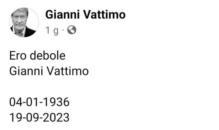 Solamente due giorni fa, in data 19 Settembre 2023, ci lasciava un personaggio di spicco nella filosofia italiana contemporanea: Gainteresio, detto Gianni, Vattimo. Il compagno, Simone Caminada, posta sui social un autoepitaffio che il nostro autore aveva chiesto espressamente di condividere, vale a dire il post che vedete in foto. Autoironia, sagacia, spirito critico e impegno politico sono tutti elementi che hanno costellato la vicenda personale e accademica di questo personaggio. Augurando ai suoi cari e ai suoi ammiratori, le nostre più sincere condoglianze, intendiamo fornire informazioni sulla vita e sul pensiero filosofico di questo protagonista del panorama culturale italiano e internazionale.