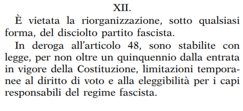Nel nostro ordinamento giudiziario la più alta fonte del diritto è la costituzione, tutte le leggi che saranno proposte e prenderanno vita dovranno rispettare i principi sanciti della costituzione. La costituzione italiana è frutto di un patto tra diversi gruppi politici, cattolici,comunisti,socialisti,liberali e altri ancora. Tutti però si trovarono d’accordo a stabilire che l’antifascismo dovesse essere un principio fondamentale. Un altro principio fondamentale erano le libertà individuali e quelle collettive, quindi per cercare di rendere la carta più democratica possibile gli articoli 49, 18 , 21 ,17 della prima parte della costituzione intitolata diritti e doveri dei cittadini esprimono dei principi che affermano alcune libertà collettive come la libertà di associazione dei cittadini in partiti o organizzazioni che rientrino nel contesto democratico. Nella parte finale della costituzione la XII disposizione transitoria vieta esplicitamente la creazione del disciolto partito fascista italiano, quindi un partito che può rivendicare simpatie su quel fronte ma attenendosi alle regole democratiche senza uscire dagli schemi può svolgere il suo ruolo del gioco politico. L’escalation degli ultimi tempi nei confronti dei partiti neofascisti non ha un significato comprensivo dato che è dalla nascita della repubblica italiana che esiste un partito che rivendica in un certo senso l’affinità con le idee fasciste. In questo modo si sta facendo proprio ciò che essi desiderano, cioè ottenere visione e essere messi al centro del dibattito pubblico.