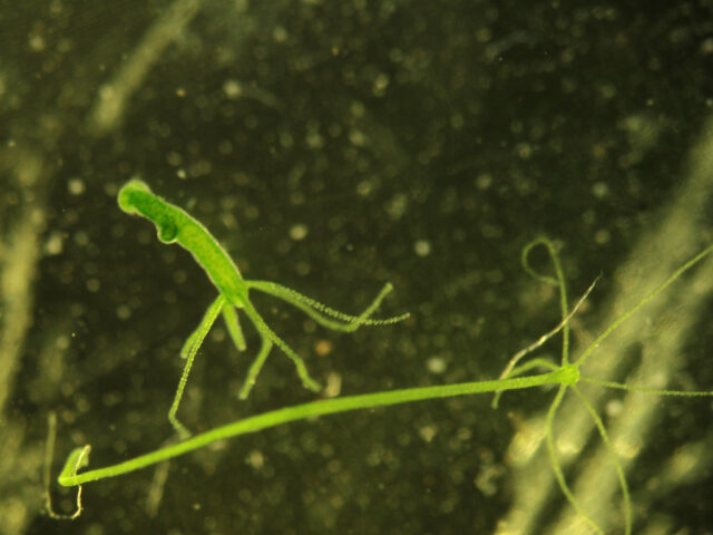 La cosa curiosa è che immergendoci nelle acque dolci potremmo incontrare quello che sembra il microscopico cugino di Junior: l’Hydra, con il quale non solo condivide quest’incredibile capacità ma anche l’aspetto verde e ondeggiante. L’Hydra è un idrozoo di 10mm del phylum degli Cnidari e prende il nome dal suo omonimo mitologico, l’Idra di Lerna, il leggendario mostro a nove teste ucciso da Eracle. Il suo corpo è a forma di vaso con un’unica bocca dalla quale si diramano dei tentacoli che utilizza per catturare le prede. Si tratta di un animale molto semplice ma per la sua abilità di rigenerazione estremamente efficace, è considerato un organismo modello da studiare.