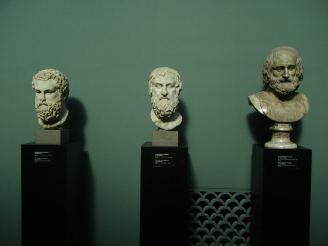 Euripide (480-406 a.C.) è considerato l’ultimo dei grandi tragediografi dell’Atene Classica. Egli è portavoce di un nuovo modo di intendere il valore civico del teatro in una città ormai sconquassata dalla guerra e alla ricerca dei valori perduti del tempo antico. Nel 415 a.C. alle Grandi Dionisie Euripide mette in scena le Troiane, una tragedia che racconta il destino delle donne di Troia che diventano bottino degli Achei vincitori. Cassandra, Andromaca, Ecuba devono diventare schiave dei capi dei Greci e vedere la loro patria bruciare. Euripide, attraverso una grande sensibilità di carattere psicologico, porta sulla scena la crudeltà della guerra vista con gli occhi degli sconfitti. Le donne troiane soffrono un dolore tremendo per la perdita di tutto ciò che avevano di più caro al mondo: i figli, i mariti, la casa, la patria. Questa tragedia assume ancora più valore se inserita nelle circostanze storiche del 415 a.C.: come abbiamo visto prima, Atene era reduce dalla sanguinosa spedizione contro Melo dove aveva dato prova di efferatezza e tirannia. Euripide, quindi, sembra voler portare all’attenzione dei suoi concittadini la brutalità di qualunque conflitto (fittizio come quello di Troia o reale come quello di Melo): il tragediografo, all’interno del dramma, inserisce alcuni episodi sintomatici di una “critica alla guerra”. Nel prologo dell’opera, ad esempio, il dio Poseidone dialogando con Atena dopo la distruzione di Troia dice
