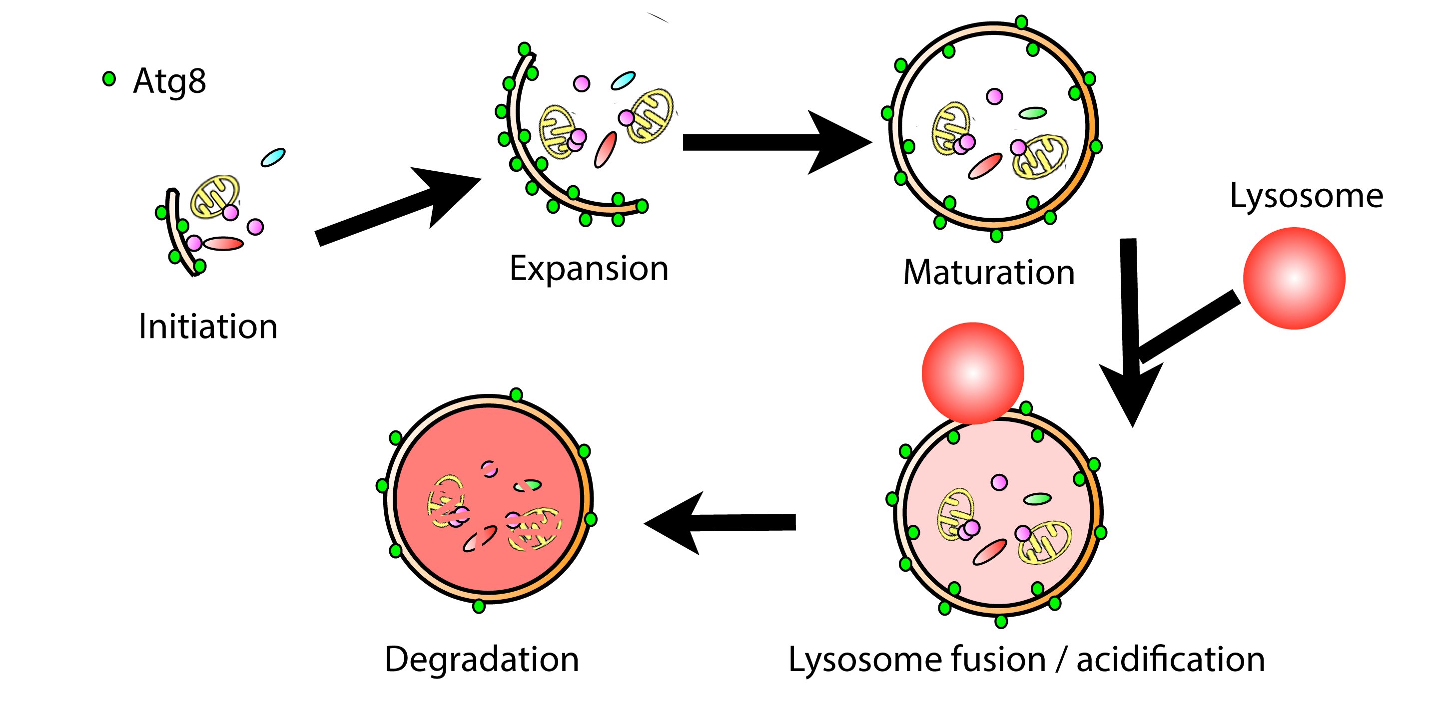 Il processo che più ci interessa però, è quello della macroautofagia. La macroautofagia è un meccanismo di reazione della cellula a molti stress ambientali. È promossa da fattori esterni come le radiazioni, le infezioni e la mancanza di nutrienti. Consiste nella digestioni di interi organelli o insiemi di molecole di grandi dimensioni. Queste grandi strutture vengono avvolte da una membrana. Sopraggiunge poi un lisosoma, pieno di enzimi digestivi. Con l’unione delle due membrane sulle molecole da distruggere, tutti gli enzimi del lisosoma le scompongono nei loro componenti primari, che vengono così resi disponibili alla cellula per svolgere tutte le funzioni necessarie. La macroautofagia include per primi gli organelli e le strutture malfunzionanti o vecchi: garantisce quindi un riciclo dei componenti mal funzionanti. A differenza del proteasoma, l’autofagia non è un processo attivo di regolazione, ma di difesa. La cellula dall’autofagia trae energia, ma non la considera una funzione essenziale.