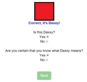 Ai partecipanti, 500 adulti, vengono presentate diverse combinazioni di forme. Una di queste è un oggetto del tutto inventato, chiamato “Daxxy”, le cui caratteristiche sono quindi sconosciute ai partecipanti. Il loro compito è provare a indovinare, ricevendo per ogni forma, durante il gioco, un feedback negativo o positivo. Un po’ come il gioco “acqua, fuocherello, fuoco!”. A ogni congettura, viene chiesto ai partecipanti di riportare il grado di certezza delle loro affermazioni.