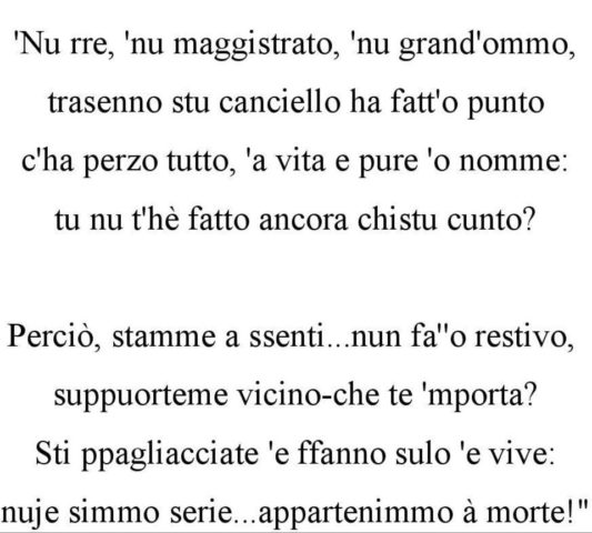 Totò, nome d’arte del principe Antonio De Curtis, narra di un immaginario incontro di due anime nel giorno della Commemorazione dei defunti. L’autore presenta la visita alle tombe dei propri cari come un obbligo morale, un dovere imprescindibile che rispecchia una tradizionale ricorrenza. Secondo Totò “ognuno adda tené chistu penzier”, ognuno deve recarsi al cimitero e sottolinea quanto lui tenga a non venir meno a tale “crianza” andando puntualmente il 2 Novembre al “loculo marmoreo” di sua zia Vincenza. Con tono enfatico, l’autore esorta il lettore ad ascoltarlo, prestando attenzione a quanto accaduto. Il nobile marchese Signore di Rovigo e di Belluno è deposto in un tumulo adornato da croci, lettere commemorative, liste con le onorificenze accumulate, candele e corone di fiori. Poco distante, il visitatore incappa nella tomba di un umile netturbino sulla cui lapide abbandonata e dissestata è a mala pena visibile il nome. Il protagonista si ritrova chiuso nel cimitero e allo scoccare della mezzanotte, vedendo avvicinarsi due ombre, si chiede se fosse desto, se stesse sognando o se la sua fantasia stesse delirando. L’uomo assiste allo scontro verbale tra il merchese e il netturbino riguardo alla vicinanza dei loro tumoli. Il nobile incalza il povero operaio accusandolo di ever oltraggiato la sua tomba riposando accanto a lui. Il netturbino, mortificato, afferma di non aver colpe in quanto sono stati i suoi familiari a scegliere il luogo della sepoltura e dice che, se dipendesse da lui, si sposterebbe ben volentieri. Il marchese accresce sempre più la propria ira e prima di giungere “all’eccedenza”, il netturbino enuncia il suo concetto di morte. Quando un individuo passa a a miglior vita, nulla è più come prima: egli perde tutto, la vita e “o ‘nnome”. Le distinzioni sociali sono un aspetto concreto nella quotidianità, sono un marchio che ci si porta dietro nel corso dell’intera esistenza compromettendo, in molti casi, l’opinione altrui. Il netturbino sottolinea che tali differenziazioni si annullano al termine della vita, che i titoli non sono più validi, che sono “pagliacciate” appartenenti al mondo dei viventi : loro sono diversi, resi seri sotto il colpo falce mortale che ha reciso i contrasti dovuti alle gerarchie sociali.