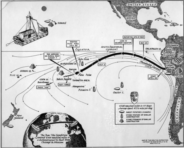 L’impresa dell’esploratore norvegese era quella di dimostrare la possibilità di un viaggio transoceanico in età precolombiana. Un missione, potremmo dire, di corredo alla sua teoria, volta a confermarne la reale fattibilità, ma che ben presto divenne fulcro della sua carriera. Per avvalorare la sua idea, la zattera sulla quale viaggiò, chiamata simbolicamente Kon-Tiki, fu costruita con tecniche e materiali d’età preistorica. Ad appoggiarlo c’erano oltre la sua Norvegia, anche il Perù che aveva solo da guadagnarci nel caso l’antropologo norvegese avesse ragione, e gli Stati Uniti, i quali gli fornirono le razioni di cibo militari per testarle in quelle condizioni. Il tutto divenne un vero e proprio caso mediatico.