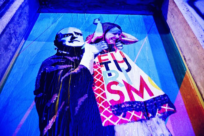 Se la pellicola di Mel Brooks aveva già fatto tanto ridere nei lontani anni ’70, nelle ultime ore queste risate stanno assumendo una sfumatura decisamente più sardonica. Il motivo è da ricercare nei murales apparsi proprio nella notte di Halloween davanti al Palazzo delle Esposizioni in Via Nazionale. A renderli così tanto interessanti non sono i personaggi in sé per sè, bensì i volti che l’artista ha deciso di ritrarre. Ecco che Igor, il famoso aiutante del Dottor Frankenstein, assume le sembianze dell’ex ministro della cultura Sangiuliano e l’attuale presidente del consiglio, Giorgia Meloni, viene sollevata dal mostro come se fosse lei stessa la nuova creazione. Non risulta difficile constatare la somiglianza del mostro con una figura ben nota del panorama politico nazionale degli anni ’40 del secolo scorso. Insomma, creazioni artistiche davvero difficili da mandar giù, soprattutto se si pensa che sotto alla scritta “Futurismo”, che dà il nome al trittico di murales, si intravede la parola “Fascismo”.