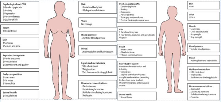 Per le persone transgender la terapia ormonale causa lo sviluppo di numerose caratteristiche sessuali secondarie anche se molte di queste non possono essere invertite semplicemente con la somministrazione di questi farmaci. Solitamente vengono utilizzati fitoestrogeni e antiandrogeni come farmaci femminilizzanti mentre viene introdotto il testosterone come ormone mascolinizzante, rendendo le corde vocali più spesse, facendo aumentare la massa muscolare, perdere i capelli e ispessire la pelle.