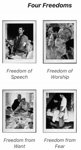 Franklin D. Roosevelt, 32esimo presidente degli Stati Uniti dal 1933 fino alla sua morte nel 1945 in un celebre discorso durante la seconda guerra mondiale afferma la sua idea democratica.Il discorso di Roosevelt verteva con la democrazia e la libertá di poter vincere la guerra.Questo pensiero nel gennaio 1941 ispiró un grande artista e attivista dell’epoca che combatteva a favore degli essenziali diritti umani che dovrebbero essere universalmente protetti quali la libertá individuale, il diritto all’autodeterminazione, il diritto a un’esistenza dignitosa e la libertá di religione e di pensiero. Norman Percevel Rockwell, nato il 3 Febbraio del 1894 e in vita fino al 1978 e’ stato un autore americano, pittore e illustratore. I suoi lavori erano esclusivamente pensati per il popolo Ameericano e riflettevano proprio la cultura statunitense nell’ ultima parte del secondo conflitto mondiale. L’artista ripropone le quattro scene piú folcroristiche. Precisamente Rockwell dipinse la serie Four Freedoms, che fu completata in sette mesi. Si tratta di quattro opere ad olio- Freedom for Fear, Freedom of Worship, Freedom from Want, and Freedom from Fear. Le opere sono tutte approssimativamente 116cm per 90cm, attualmente conservate nel Museo di Norman Rockwell in Stockbridge, Massachusetts.