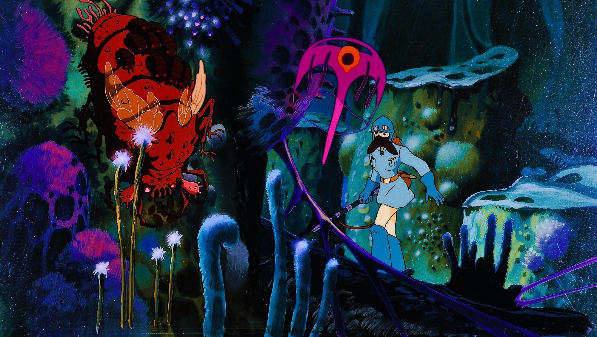 Tratto dall’omonimo manga di Miyazaki pubblicato sulla Animage dal 1982, Nausicaä della Valle del Ventosarebbe passato alla Storia come il primo grande lungometraggio del regista giapponese – preceduto solo da Lupin III – Il Castello di Cagliostro del ’79 – inserito retrospettivamente nella collezione di prodotti dello Studio Ghibli, anche se a esso antecedente, proprio perché permise in un certo senso la sua fondazione. Un debutto che già nei suoi sfarzosi titoli di testa incarna premesse da epica impegnata e seria: il mondo postapocalittico in cui vive Nausicaä è stato devastato mille anni prima dai Sette Giorni di Fuoco, una guerra lampo termonucleare combattuta dai Soldati Invincibili, giganteschi automi biologici creati dall’uomo ed equipaggiati con armamenti atomici. Ma se i pochi sopravvissuti hanno imparato ad adattarsi al panorama desertificatoseguito all’apocalisse, una nuova nuova minaccia incombe sugli insediamenti umani: il lento ma inesorabile avanzare di una gigantesca foresta velenosa che si estende a macchia d’olio come un cancro, inghiottendo con le sue spore velenose e i suoi giganteschi insetti tutto ciò che incontra sul suo cammino.