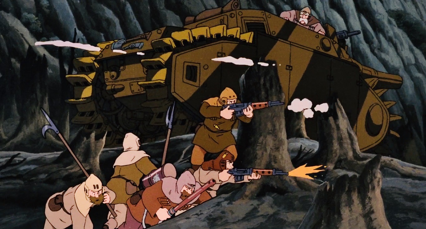 Il prodotto di Miyazaki ha le tipiche sembianze epiche di un tipico film che però di tipico non ha proprio nulla. Nella pellicola dell’84 convergono ricchezze, e contenutistiche e formali, fra le più disparate. Già solo il tentativo di incasellare il film in un singolo genere cinematografico fallisce miseramente. I combattimenti aerei che coinvolgono le navi tolmechiane non hanno nulla da invidiare alla migliore suspance fantascientifica, ma devono anche molto alla passione di Miyazaki per la Storia dell’Aviazione – già lo Studio Ghibli traeva il suo nome, fra le altre cose, da un modello di aeromobile italiano d’Anni ’30, soggetto poi largamente affrontato nel 1992 con Porco Rosso. Quelli terrestri fra i ribelli della Valle del Vento e l’esercito di corazzati, invece, ricordano tanto le migliori scene di guerra di trincea, ma anticipano anche il più recente Fury (2014) di David Ayer in ritmi e inquadrature. Per non parlare dell’immaginario scenografico e costumistico di Miyazaki, che fra astronavi ipertecnologiche e soldataglie protette da corazze medievali ha tanto il sapore della distopia steampunk.
