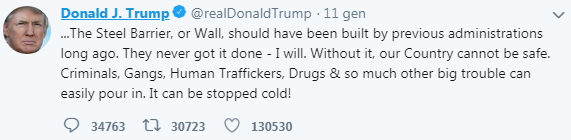 Da parte sua, il presidente Donald Trump ha detto che non dichiarerà “così velocemente l’emergenza nazionale” con la quale potrebbe ottenere i fondi per il muro il Messico. “Sarebbe una soluzione facile per me dichiarare l’emergenza nazionale, ma non lo farò così velocemente”, afferma Trump dicendosi convinto che il muro e la sicurezza del confine “siano qualcosa che il Congresso può fare”. Ma Trump appare determinato ad andare avanti sulla sua strada: ”La barriera d’acciaio, o il muro, avrebbe dovuto essere costruita dalle precedenti amministrazioni molto tempo fa. Non lo hanno fatto, io lo farò” twitta il presidente.