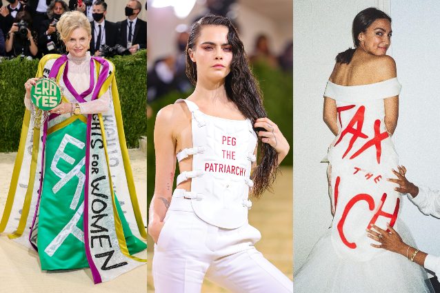 Dallo statement di Cara Delevingne al messaggio femminista della congresswoman Carolyn Malone, la passerella ha accolto una sfilata di messaggi rivoluzionari. Se eravamo abituati agli abitati luccicanti di Rihanna e Beyoncé le cose sono cambiate: adesso è l’impegno per il sociale a tenere testa. Come ha detto la stessa vincitrice, nonché membro della camera dei rappresentati di New York, la moda può essere utilizzata come mezzo per fare politica. La scritta in rosso su sfondo bianco è “Tax the Rich” letteralmente tassate i ricchi. Ma cosa significa esattamente? Alexandria Ocasio-Cortez, meglio conosciuta come AOC, si è già fatta sentire in passato per temi come il razzismo e nella campagna Black Lives Matters. Questa volta il messaggio, però, è indirizzato alle classi sociali; come sappiamo, la pandemia sta colpendo duramente un tessuto produttivo, economico e sociale. Ad accompagnare il periodo drammatico che stiamo vivendo è il divario sempre più ampio tra ricchi e poveri: i ricchi sono sempre più ricchi, e i poveri sempre più poveri. Già in passato un evento simile era accaduto. Sempre in America, la cantante Joy Villa si era presentata ai Grammy 2019 in abito bianco con un messaggio sul retro. Il look era ispirato allora al muro di confine del presidente Trump con un motivo a mattoni all-over e le parole Build That Wall scritte in rosso sul retro.