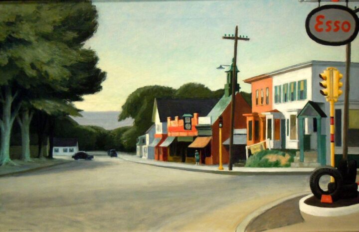 A primo impatto, l’opera potrebbe sembrare la semplice rappresentazione di una cittadina tranquilla, ma in realtà si concentra sulla prospettiva attraverso la quale essa si presenta al conducente dal suo sedile. L’atto di guidare riorienta il paesaggio in modo che i protagonisti non siano la città o il paesaggio, bensì il movimento, il percorso di chi la attraversa. La struttura del dipinto non dirige la nostra attenzione su nessun punto specifico: tutto sembra sfocato e privo di dettagli, tranne l’insegna della stazione di servizio Esso nell’angolo in alto a destra (potrebbe essere la stessa che ha attirato Jack Gladney nella nube tossica!). Nella sua infinita corsa verso un domani inafferrabile e mortifero, ricaricare il serbatoio e proseguire dritto senza prestare attenzione a nient’altro che lo circondi è l’unica cosa che cattura davvero l’interesse dell’uomo. L’atmosfera creata da Hopper, nella quale il tempo sembra essersi arrestato e l’umanità scomparsa, è angosciosa e desolante.
