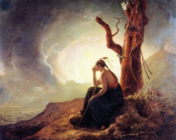 Tra i dipinti più maturi dell’artista “La vedova di un capo indiano veglia dinnanzi alle armi del marito defunto” è uno dei più evocativi. Questa tela, datata 1784, vede come protagonista una donna che si staglia davanti alla luce del sole e ad un cielo plumbeo, resa in maniera estremamente neoclassica, tanto per la posa quanto per l’alto contenuto morale sprigionato dalla scena. Allo spunto neoclassico si aggiunge però una minuziosa descrizione dei particolari che vanno a connotarne la cultura indiana quali piume, abiti ed armi. E’ così che va esprimendosi il concetto di “buon selvaggio”, mito secondo cui la società moderna ha corrotto l’uomo prima docile e pacifico. Quello della donna è un dolore tanto silenzioso quanto straziante, caratterizzato da segni che lasciano percepire l’assenza e la mancanza del marito ormai defunto.