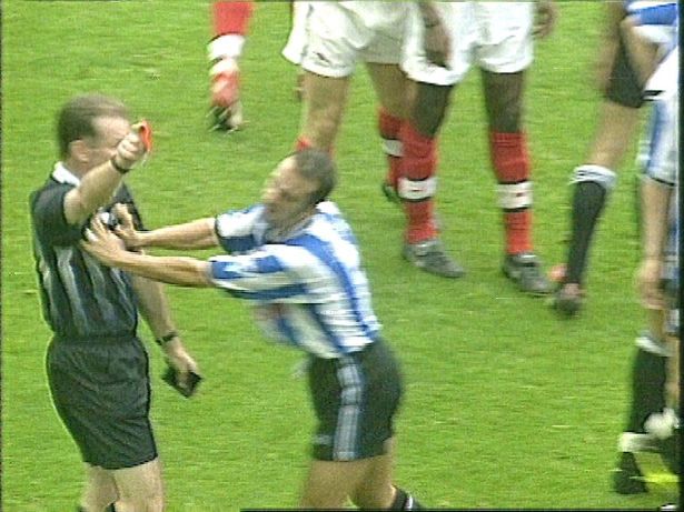Paolo Di Canio, attaccante italiano, spinge a terra il direttore di gara che cade rovinosamente a terra. Violenze contro gli arbitri avvengono non solo sui campi provinciali, dove sono all’ordine del giorno, ma anche nel calcio professionistico (Get Surrey)