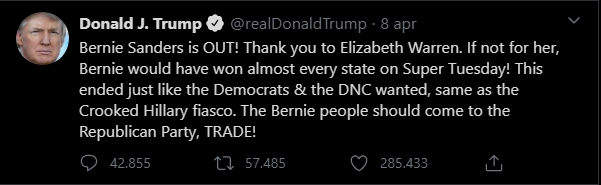Biden gli ha subito risposto : “Sanders è una persona per bene, un grande leader. So quanto sia stato difficile per lui e per i suoi sostenitori rinunciare. Ma ha messo l’interesse della Nazione sopra ogni cosa. Lo ascolterò, affronteremo insieme il climate change. Renderemo la sanità e le università accessibili a tutti. Insieme sconfiggeremo Trump e trasformeremo questo Paese“. A rovinare questo clima “tarallucci e vino” anche tra avversari a cui nel nostro paese non siamo troppo abituati, ci pensa il Presidente Trump con un tweet: “Bernie Sanders è FUORI! Grazie a Elizabeth Warren. Non fosse stato per lei, Bernie avrebbe vinto in quasi tutti gli Stati nel Super Martedì. Finisce proprio come volevano i Democratici e il Comitato nazionale del partito, cioè nello stesso modo che abbiamo visto con il fiasco della corrotta Hillary. I sostenitori di Bernie dovrebbero venire nel partito repubblicano, SCAMBIO!».