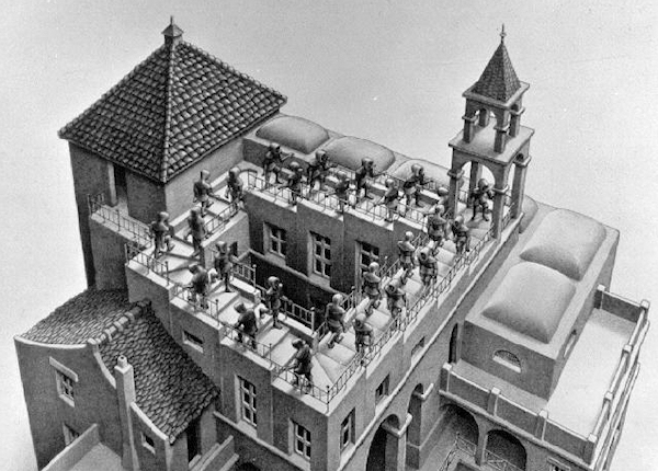 Lo stesso procedimento è attuato anche in Salita e Discesa (1960), in cui l’artista rappresenta un complesso di case i cui abitanti, dei monaci, camminano in un percorso circolare fatto di scalini. Apparentemente tutto sembra regolare, ma ad un’osservazione più attenta, ci si accorge che i personaggi compiono un percorso sempre in discesa o sempre in salita, lungo una scala impossibile, al termine della quale non si potrà mai giungere.