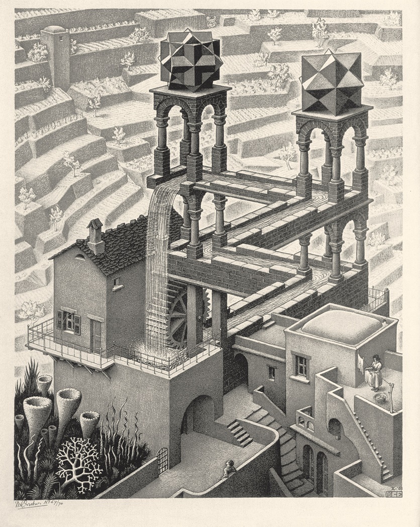 Nell’illustrazione Cascata, del 1961, per esempio, un flusso d’acqua, cadendo dall’alto, mette in funzione un mulino il quale, a sua volta, spinge il flusso in un canale che, zigzagando, torna all’inizio della cascata. La cascata rappresenta un sistema chiuso: essa ritorna in continuazione alla ruota del mulino in un movimento perpetuo.