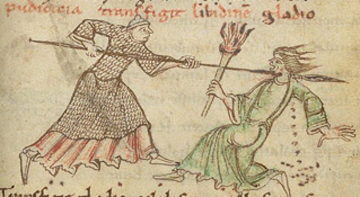 Aurelio Prudenzio Clemente è stato probabilmente il primo ad immaginarsi una lotta intesa nel senso letterale tra le virtù e i vizi. Scrive infatti un poema allegorico, dove personifica 10 virtù (fede, pudicizia, pazienza, umiltà, speranza, sobrietà, carità, pace, concordia, saggezza) e 8 vizi (idolatria, libidine, ira, superbia, lussuria, avarizia, cupidigia, discordia). In questo poema le due fazioni si scontrano in sette battaglie, precedute da un proemio in cui l’autore chiede a Gesù Cristo di aiutarlo a far vincere le virtù sui vizi.